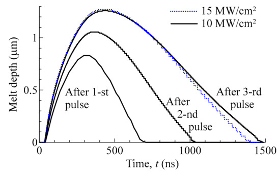 Figure 9 shows the calculated dynamics of the melting/solidification front. The maximum melt depth estimates the thickness of the surface layer with the modified structure. This value appears to be approximately the same for the single laser pulse with Imax = 15 MW/cm2 and for the sequence of three weaker pulses with Imax = 10 MW/cm2 (see Figure 9). It is slightly greater than one micron. However, the parameters of vapor are quite different. Table 4 compares the parameters at 200 ns after the beginning of the single pulse with Imax = 15 MW/cm2 (t = 0.2 μs in Figure 4) and the third pulse of the sequence with Imax = 10 MW/cm2 (t = 20.2 μs in Figure 7). In both cases, the vapor temperature is about 3000 K. The vapor pressure at 15 MW/cm2 is four times the pressure at 10 MW/cm2. The thickness of the vapor domain at 15 MW/cm2 is four times its thickness at 10 MW/cm2. In summary, at the miltipulse laser processing, vapor is considerably less dense and occupies a considerably thinner domain.