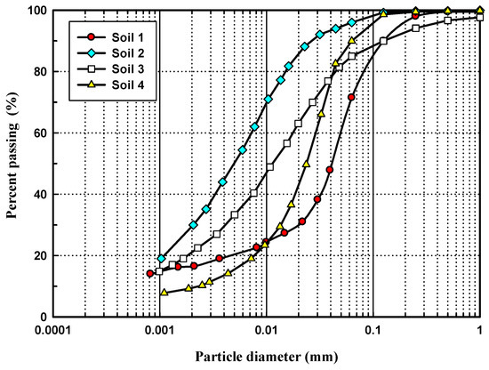 Four different types of soil were used in this study. The soils were chosen to be of different character and locations. Soil 1 was excavated from Gothenburg, south west coast of Sweden. Soil 2 and 3 were excavated from different depths in Sunderbyn area in Luleå, the northernmost part of Sweden. Soil 4 was excavated from Umeå, in the north east part of Sweden. The soils were classified by tests of particle size distribution, consistency limits, loss of ignition, chemical composition, pH and specific gravity. The physical and mechanical properties are presented in Table 2. The chemical composition of the tested soils was obtained in a certified laboratory as listed in Table 3. The particle size distribution of the tested soil is shown in Figure 1. The soils were classified according to the Swedish standard. Organic content showed that organic content ranged from 2.7% to 6.8%. The soils were classified as having low to medium organic content [27,28].