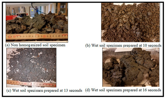 Figure 4 shows the visual assessment of Soil 2 before and after disintegration at various times. It can be seen in Figure 4a that the soil specimen contained a wide range of agglomerated particles from 1 to 9 cm in size. After homogenizing the soil specimen at disintegration times of 10 and 13 s, it was found that the agglomerated particles in the soil started to break up into small-sized particles, as shown in Figure 4b,c. However, when the disintegration time was increased to 16 s, the soil particles started to agglomerate and adhere to each other and became stickier, as shown in Figure 4d.