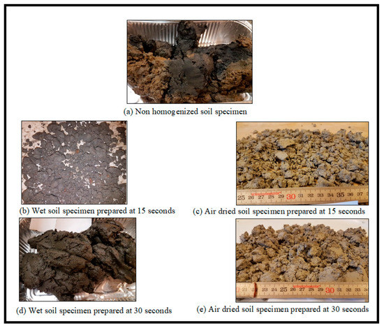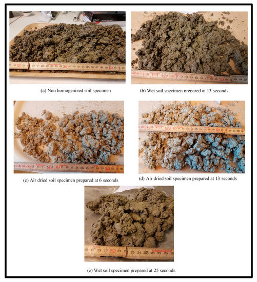 Figure 5 shows the visual evaluation of Soil 3 before and after disintegration at various time periods. Figure 5a shows that the original soil specimen consisted of a wide range of agglomerated particles ranging from a few millimeters to about seven centimeters. After homogenizing the soil at 6 and 13 s disintegration times, the agglomerated soil particles started to break into small-sized particles, as shown in Figure 5b–d for both wet and air-dried specimens. Subsequently, when the disintegration time was increased up to 25 s, the soil particles started to agglomerate and adhere to each other until they became almost one piece of soil, as shown in Figure 5e.