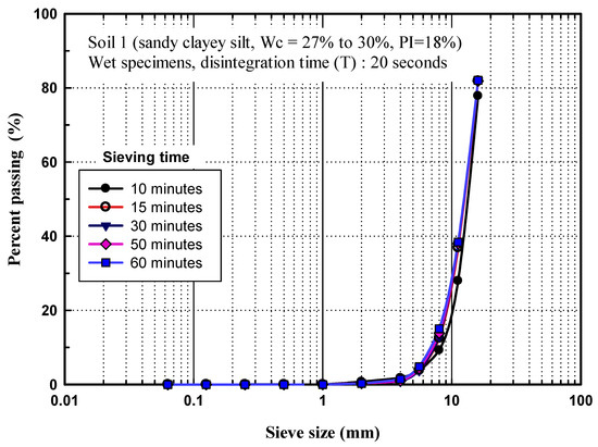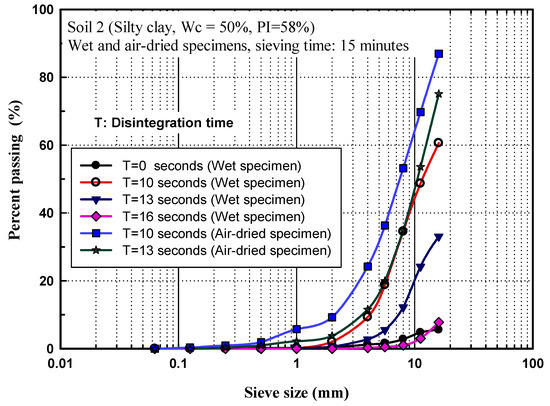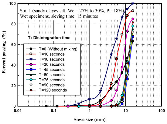 Soil 1 was classified as sandy clayey silt with medium plasticity. The soil water content was below the liquid limit. The median particle diameter (D50) was 13 mm for the non-homogenized soil specimen (Figure 8). For the wet soil specimens, the D50 decreased to 5.5, 4 and 9.5 mm after the soil was homogenized for 10, 16 and 30 s, respectively. When the disintegration time was increased in several steps up to 120 s, the D50 was increased to 16 mm. For the air-dried specimens, the D50 was about 3 mm after the soil was homogenized for a 17 s disintegration time (Figure 9). The passing percentage was almost the same for the wet and air-dried specimens at a low disintegration time (less than 17 s) and high for wet specimens compared to the air-dried specimens when the disintegration time was increased to 30 s. This can be related to the medium plasticity properties of the soil in addition to the water content being below the liquid limit of the soil. When the soil particles agglomerated and adhered together at a high disintegration time, it became difficult to break them up again during the sieving process and they tended to stick in the opening of the sieve. The ideal disintegration time for Soil 1 ranged between 10 and 20 s and should not exceed 30 s.