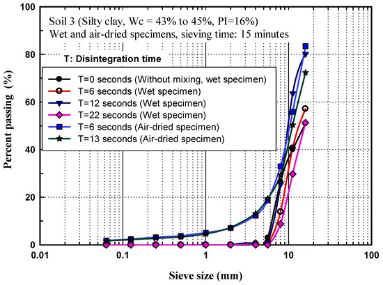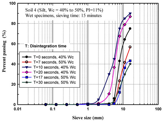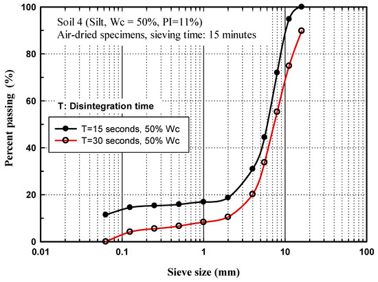 In contrast, the D50 ranged between 6 and 7 mm for the air-dried specimens prepared at 15 and 30 s disintegration times, respectively and with an initial water content above the liquid limit. The passing percentage for the air-dried specimens was significantly higher compared to the wet specimens prepared with the same disintegration time and initial water content (50%), as shown in Figure 12 and Figure 13. Due to the low plasticity properties of Soil 4, the variation between the wet and air-dried specimens was related to the high-water content of the soil, which made the wet soil particles adhere to each other after disintegration and stick to the sieve openings. This clearly showed the effect of water content in low plasticity soil.