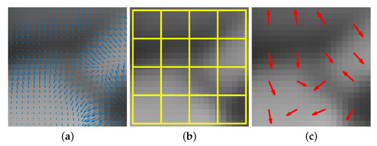 Figure 5 shows the 16 divided sub-patches and the main gradient computed by PCA on a local gradient field. These 16 main gradients generate the second part of the feature vector. The final