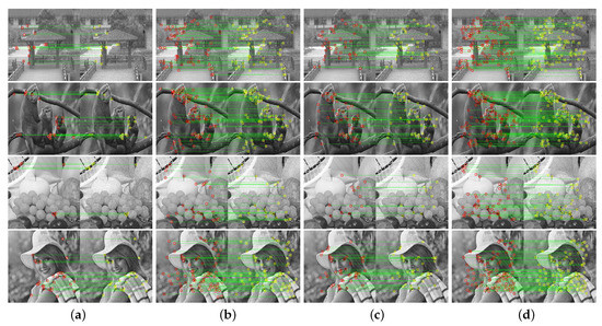 Figure 7. The columns from left to right mean different methods: Harris, SIFT, PCA-SIFT, and the proposed method. Harris finds the least matching number while SIFT and PCA-SIFT achieve better performance. More matching can be found by the proposed method than others in this test. It can be found that 91 matches in the Pavilion image pair while 100 matches in the Monkey image pair by the proposed method. In addition, 52 matches and 98 matches can be found independently in the Fruits image pair and Elaine image pair. More details of an accurate matching number can be found in
