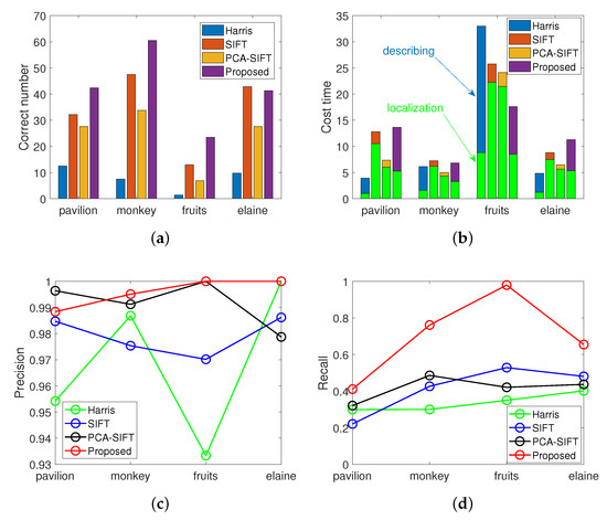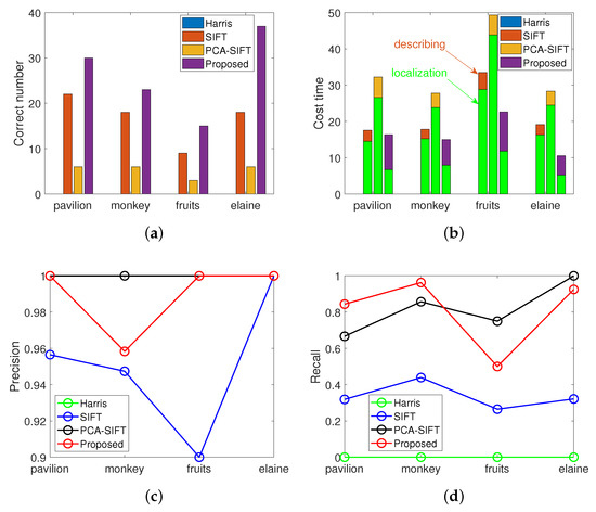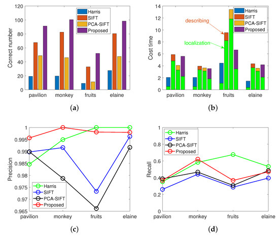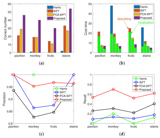 Figure 7c,d. It can be found PCA-SIFT loses on precision but gains on recall compared to SIFT. The proposed method can achieve higher precision and recall than SIFT and PCA-SIFT, but roughly equivalent to Harris.