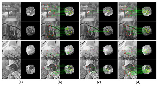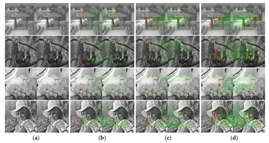 Figure 9a, Harris finds the least matching number in each image pair. The proposed method finds the most matches in three of four image pairs. It can be found that there are 42 matches in the Pavilion image pair while 60 matches in the Monkey image pair. In addition, 23 matches and 41 matches can be found independently in the Fruits image pair and Elaine image pair. More details of accurate matching numbers can be found in