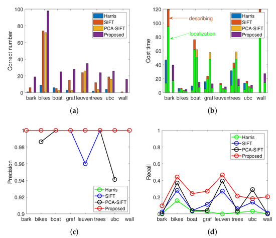 Figure 15b, the proposed method achieves better performance on cost time than Harris and SIFT but worse than PCA-SIFT. Though Harris finds the least matches, it still achieves the best performance on Precision excluding Leuven and Wall. The proposed method achieves the best performance as shown in