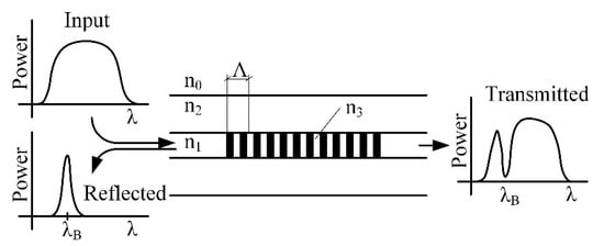 When a broadband spectrum of light passes through the structure of the Bragg grating, selected wavelengths in a narrow part of the spectrum are reflected, while other wavelengths are transmitted. The reflected part of the spectrum is called Bragg wavelength and is expressed by Equation (1):