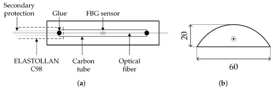 The optical fiber was pre-stressed by 500 pm in the carbon tube and glued at both ends with a two-component adhesive. A supplying optical fiber with a width of 900 m and length of 5 m was inserted into a protective ELASTOLLAN C98 polyurethane tube (Gumex, Brno, Czech Republic) along with internal and external protective tubes with outer diameters of 2 mm and 4 mm, respectively, and a wall thickness of 1 mm.