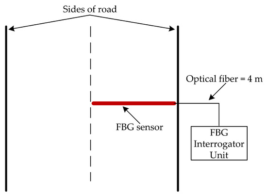 An invasive method for monitoring selected road traffic parameters which included detecting vehicles and vehicle speed and weight was conducted on the I-84 highway in Portland using five FBG (fiber Bragg grating) sensors installed into the asphalt pavement at a depth of 7 cm [25,26]. Insufficient protection of the FBG sensors resulted in damage to the sensors. The authors successfully solved this problem by adding composite fiber protection to the FBG sensors.