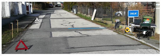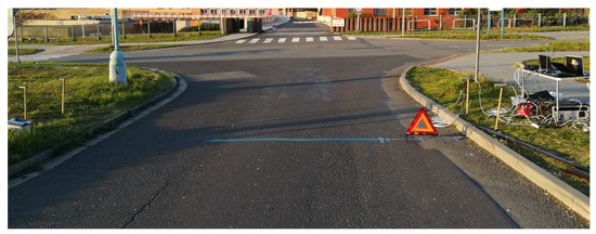 The portable sensor strip was placed on the outer edge of the road, which had a width of 5.125 m (Figure 5). The road was narrowed during the measurements with warning triangles so that cars passing in both directions would be forced to pass over the measuring strip. The reason for narrowing the road during measurement was to obtain relevant information about the total traffic density on the local road.