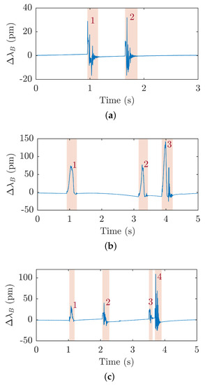 The signal from the FBG sensor was filtered by a high-pass filter (Butterworth fourth order) with a cut-off frequency of 0.4 Hz in order to remove the slow component corresponding to the fluctuation of ambient temperature. The peaks (individual car axles) were then identified in the signal and individual car passes were detected.