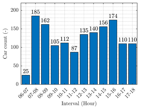 A total of 1518 cars passed during the measurement period (1515 passenger cars, 2 passenger cars with a two-axle trailer and 1 truck with three axles). Only 1502 cars were correctly detected using the sensor strip. The remaining 16 passes were not detected because the vehicles passed the sensor strip outside the active area. The overall efficiency of detecting cars was 98.946%. The density of operation at hourly intervals is shown in Figure 10.
