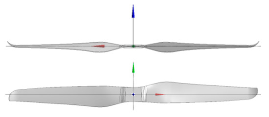 The propeller is made of carbon fiber with a diameter of 400 mm and a weight of about 0.015 kg. The propeller has two blades and the rotation speed ranged from 1500 RPM to 2300 RPM. Therefore, the blade tip Mach number is 0.1–0.14 and the blade tip Reynolds number is 0.8 × 105–1.2 × 105. The diagram of the propeller is shown in Figure 1. The characteristics of the propeller are shown in Table 1.
