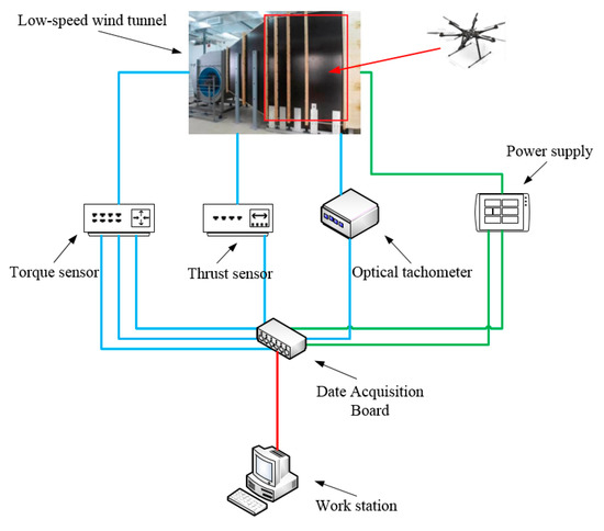 According to the theoretical analysis, we need to measure the Revolutions Per Minute (RPM), thrust, torque, and power consumption (current and voltage) to obtain the PL during the experiments. In addition, a low-speed wind tunnel was applied to simulate the horizontal airflow, and the wind speed was set as 0 m/s, 2.5 m/s, and 4 m/s. The experimental setup is shown in Figure 2.