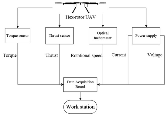 As shown in Figure 2, the main measurement components include: (1) Optical tachometer (model: DT-2234C, accuracy: 6 ± (0.05% + 1d)) was applied to record the rotation speed; (2) thrust sensor (model: CZL605, accuracy: 0.02% F.S) converted the thrust signal into an electrical signal output; (3) torque sensor (model: HLT-131, Accuracy: 0.5% F.S) was fixed on the motor to obtain rotor torque as measured by resistance strain gauge technology. The signal process is shown in Figure 3.