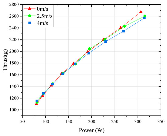 As the key parameters to analyze the hover efficiency of the Hex-rotor UAV, the thrust and power consumption are obtained with different wind speeds in Figure 4.