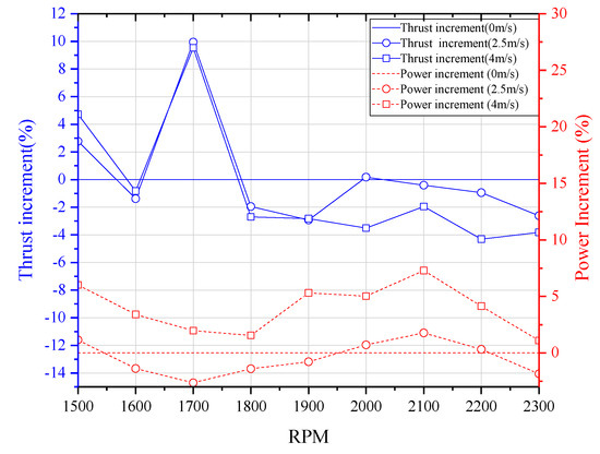 Thrust and power increments of the Hex-rotor UAV in the low-speed wind tunnel experiments are shown in Figure 5.