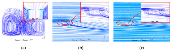 Streamline distribution (a) 0 m/s (b) 2.5 m/s (c) 4 m/s.