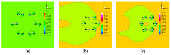 In Figure 9, the Hex-rotor UAV with different horizontal airflows had different negative pressure regions above the rotor. With the increase in the horizontal airflow, the pressure above the rotor was chaotic, and a positive pressure region appeared in the horizontal airflow direction.