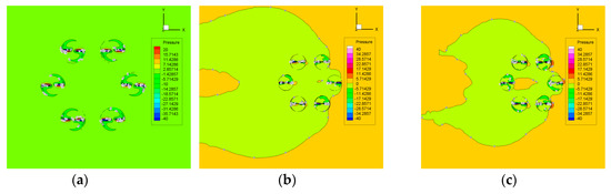 As shown in Figure 10, the pressure distribution between the rotors was uniform at 0 m/s. The pressure change around the rotor was not obvious when the horizontal airflows were involved, but the pressure change around the rotor achieved the maximum, especially at the rotor tip.