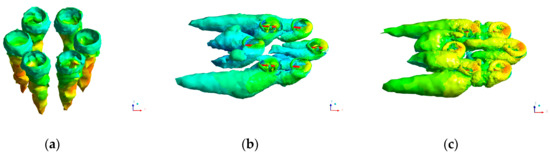 It is clear that the vortices easily shed from the tip of the rotor due to the coupled interference between the rotors. As shown in Figure 12a with the horizontal airflow at 0 m/s, the vortices that shed are below the Hex-rotor UAV. As shown in Figure 12b,c, as the horizontal airflow increased, the vortices position of the detachment moved along the wind direction. Therefore, the vortices shedding of the tip of the blade was affected by the airflow in the horizontal direction relative to the no-horizontal airflow, which reduced the aerodynamic performance of the Hex-rotor UAV.