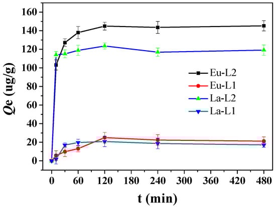 Figure 1 compares the experimental results of single La(III) and Eu(III) by using L1 or L2 at pH 4. The rapid increase of the adsorption capacity in the initial stage might be associated with the abundant reactive sites. As time increases further, the accessibility of the REEs ions to unoccupied active sites on the adsorbent surface gradually decreases, and these sites ultimately become saturated when the process reaches its equilibrium. L2 adsorbs more than L1 does, which agrees with the adsorption and desorption rate calculation results, shown in Section 3.4, later. Figure 1 shows that Eu(III) has a larger adsorption ability under identical conditions. The same tendency was found under the presence of other REEs ions (i.e., in multiple solution; refer to Figure S2). This may be attributed to the fact that the stability constant of La-EDTA is smaller than that of Eu-EDTA, which are 15.5 and 17.4, respectively [34,35]. The data of adsorption isotherms, kinetic models and the thermodynamic study were shown in Supplementary Information as Figures S3–S10 and Tables S1–S6.
