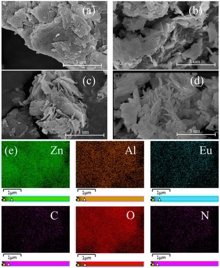 SEM images of (a) L1, (b) L2, (c) L2-La, (d) L2-Eu and (e) mapping image of L2-Eu.