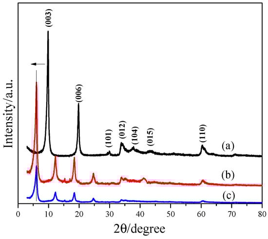 Figure 4 shows the (003), (006) and (110) peaks, which indicate that the layered structures are observed for all the L1, L2, and L2-Eu. After the intercalation by EDTA and the adsorption process, the (110) peak is still visible, as shown in Figure 4b,c. These figures show that the layer structure was destroyed by the intercalating process neither for EDTA nor for EDTA-Ln(III). However, the layer structure may be destroyed by repeated desorption process, which results in the decrease of the removal efficiency after the cycle adsorption. Based on the angle of peak (003) corresponding to the basal spacing, the basal spacing values of L1, L2 and L2-Eu were estimated to be 0.89 nm, 1.47 nm and 1.47 nm, respectively. These values were calculated by the Bragg equation. The interlayer distance was obtained by subtracting from the basal spacing to the layer width (0.48 nm) [39]. The interlayer distance of L2 and L2-Eu indicates that EDTA coexists and that EDTA is intercalated into L1 successfully. The adsorption process also increases the interlayer distance because it is close to the dimensions of EDTA complexes (0.9–1 nm) generally found for by single-crystal XRD of M-EDTA (M: Metallic ions) compound [40].
