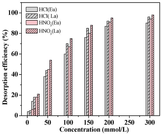 Desorption efficiency of Eu(III) and La(III) ions using HCl or HNO3.