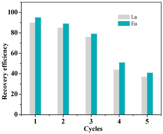 The optimum concentration was 200 mmol·L−1. The desorption efficiency of La(III) was found to be 95.67%, whereas that of Eu(III) was slightly lower; this may be due to the fact that the stability constant of Eu-EDTA (17.4) is higher than that of La-EDTA (15.5). Figure 7 shows the better reuse performance of L2 after three cycles. The hydrogen ions may destroy the structure during the desorption process, which results in the decrease of the removal efficiency after the fourth or fifth cycle.