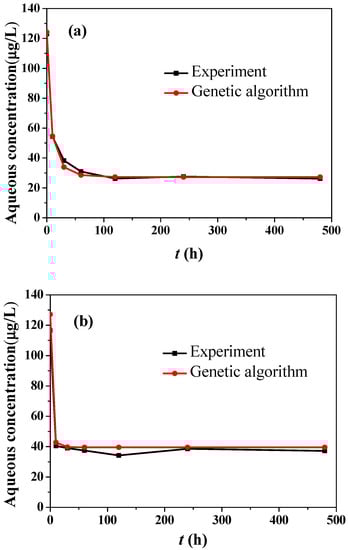 The temporal evolutions of the ion concentrations of Eu(III) and La(III) in the aqueous solution are shown in Figure 8 ((a) Eu(III), (b) La(III)). In general, the ion concentrations in aqueous solution decrease unilaterally with time, which is consistent with Equation (1). In addition, it can be found that the genetic algorithm actually fits the experimental time evolutions of the ion concentrations very well.