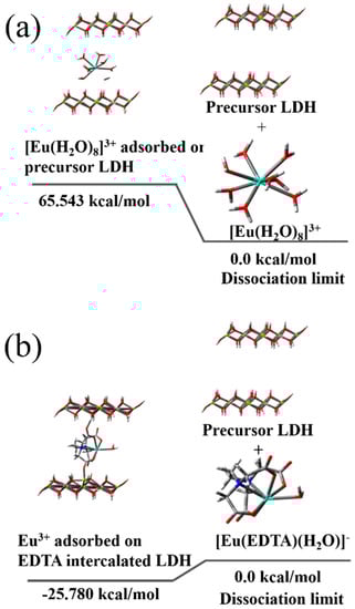 Relative energies of (a) [Eu(H2O)8]3+ adsorbed on precursor LDH and (b) Eu3+ adsorbed on EDTA-intercalated LDH.
