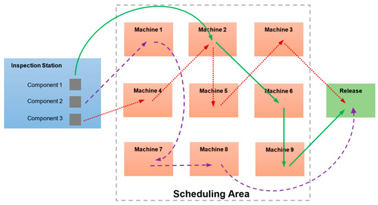 First and foremost, the MRO process is required to be properly defined in order to model the scheduling optimization problem. Figure 1 describes an example of the MRO processes that have been defined in this paper. All components are initially inspected at an inspection station. Based on the identified damages on each component, a particular process flow will be assigned for that component. The process flow defines a series of operations to process the component. The operations of each process flow follow a defined sequence. After all operations of a process flow have been executed, the component is released from the MRO. Each operation is executed via various types of resources such as personnel, machines, materials, and tools. As a simplification, a machine represents all resources required to execute an operation. The different colored arrows in Figure 1 indicate the process flows of different components. The numbers of operations in process flows can be different from component to component. Depending on damages on the components, the processing times of the operations are also different from each other. The scheduling optimization problem in this paper covers the operations to process the components after they have been inspected at the inspection station.