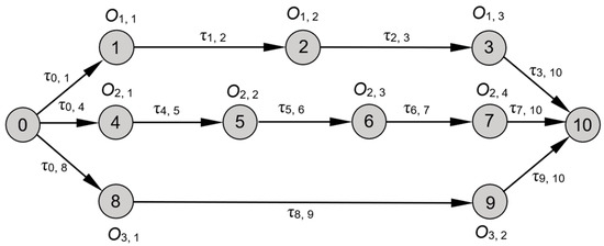 Figure 2 is a disjunctive graph to define the mathematical model of the ACO algorithm. Each node in the graph represents one operation of the jobs to be scheduled. Two more nodes are added into the graph, representing the starting and ending points. In the algorithm, each ant starts to visit all the nodes one-by-one from the starting node and complete its journey at the ending node. The schedule of the operations to be executed is constructed based on the sequence of the nodes that the ant has visited. All the operations are re-indexed from (0, 1, 2,..., N, N + 1), where 0 and (N + 1) are the starting and ending nodes, respectively. The value is the pheromone on the path that connects nodes r and s. The arrowhead lines indicate the precedence constraints between the operations within the same job. For example, the arrowhead line connecting nodes 1 and 2 indicates that the ant must visit node 1 before it can visit node 2. In other words, the operation must be executed before the operation