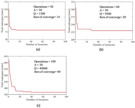 To further test the performance of the developed ACO algorithm with the total number of operations, apart from this use case (defined as small case) that consists of 30 operations of all the jobs (Figure 3a), two more cases are defined including medium case (60 operations, Figure 3b) and large case (100 operations, Figure 3c). It can be observed in Figure 3 that the parameters such as number of ants in the colony , and tuning parameter , needs to be adjusted accordingly to the number of operations in the problem. In addition, problems with more operations might require more iterative steps for the solution to converge. In the next sub-section, effects of these tuning parameters on performance of the algorithm and the number of required iterations will be discussed in details.