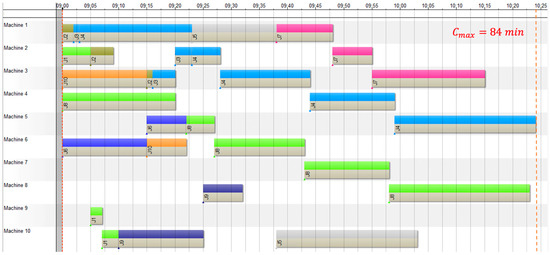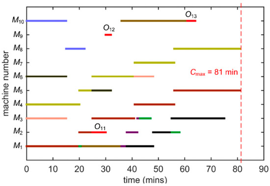 Figure 3a presents the solution of the ACO algorithm, which is the scheduling time, , resulted in each iteration during the execution of the algorithm. It can be observed that the solution starts to converge to the minimum value, , after about 10 iterations. Figure 4 shows the Gantt chart that corresponds to the optimized solution. The operations displayed in the same color belong to the same job. For example, three operations of Job 1 , and are presented in Figure 4.