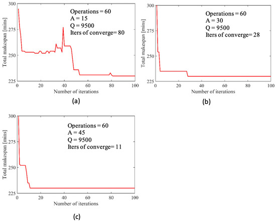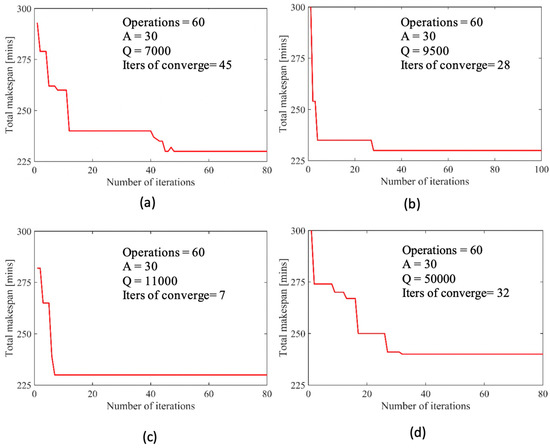 In order to investigate effect of the parameter , the same use case that has 60 operations was also used. Three test cases were experimented with the value of varied, while other parameters were kept the same. The results of these test cases are shown in Figure 7. It can be observed from Figure 7a–c that the higher value of is defined, the lesser iterations are required for the solution to converge. This is because based on Equation (4), the effect of is to amplify the enhancement of pheromone when the global updating rule is applied for the best solution. Therefore, the convergence rate towards the best solution is increased. However, it should be noted that an excessively high value of might lead to a local optimal solution. For example, in Figure 7d, the value of is increased to 50,000 and the best solution found is 240 min, while in the other cases, the best solution found is 230 min.
