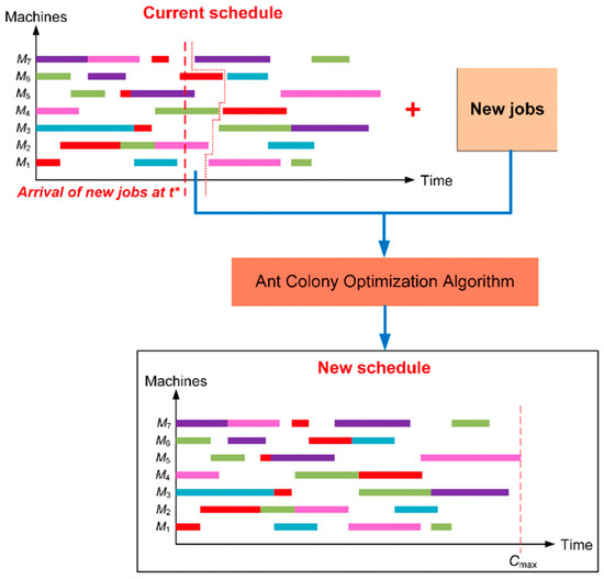 We have extended the ACO to solve the problem of dynamic scheduling or re-scheduling. In practical scenarios, during the execution of the scheduled jobs, there are usually arrivals of new or urgent work orders that need to be executed at the same time with the on-going work orders. Therefore, the current schedule needs to be updated in order to include new jobs. The ACO algorithm was developed to accommodate this requirement. Assuming that during the execution process, there are new jobs arriving at the shop floor at the time point t*. The solver firstly extracts the operations that have not been started from current schedule. Then, the ACO algorithm is implemented for these operations together with the new jobs in order to produce a new updated schedule. This process is summarized in Figure 9.