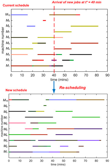 This dynamic scheduling capability has been demonstrated in our use case. Assuming that the operations were executed based on the schedule presented in Figure 4. At the time point , there are 10 new jobs arriving. The performance metric used is make-span, . Figure 10 has shown the capability of the solver in modelling dynamic job shop problem.