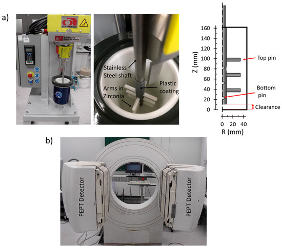 The experimental rig consisted of the laboratory-scale attritor mill HD01 (Union Process, Akron, OH, USA) and the positron emission particle tracking (PEPT) scanner showed in Figure 1a,b. The mill vessel was made of yttria-stabilised zirconia and its capacity was of 1.4 L with a diameter of 90 mm and a height of 164 mm. The impeller shaft was made of stainless steel with a plastic coating which acted as sacrificial layer, whereas the impeller arms were made of yttria-stabilised zirconia with a span of 66 mm. The grinding media used for all the experiments were 5 mm yttria-stabilised zirconia beads with a density of 5950 kg/m3. Information on the mill dimensions and grinding media are summarised in Table 1. During the experiments, the temperature inside the mill was controlled by circulating water at a constant temperature of 10 °C through a cooling jacket.