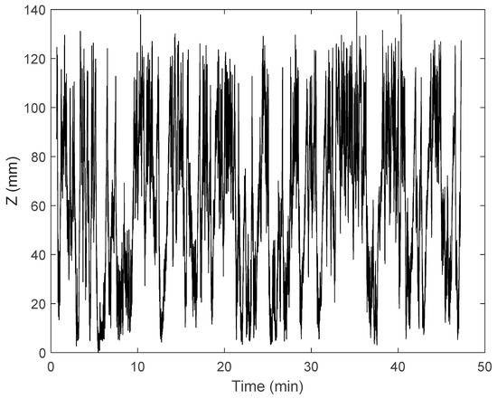 Example for a PEPT raw dataset representing the tracer particle position along the Z direction (vertical axis) over time for the impeller speed of 300 rpm.