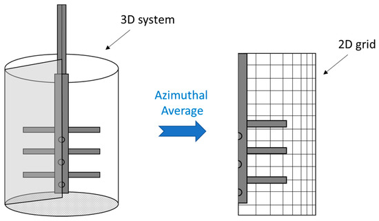 After the application of the reconstruction method, the Cartesian coordinates of the tracer over time were converted to cylindrical coordinates and the calculated-velocities were azimuthally averaged on an imposed grid as displayed in Figure 3. The grid was generated by dividing the attritor chamber into toroidal cells of equal volume under the assumption that the tracer will spend approximately the same amount of time in every part of the vessel and to simplify the determination of the distribution of occupancy per unit volume. Due to the imposition of equality of cell volumes, the dimension of the 2D cells of the grid varies in the radial direction (wider cells near the impeller and narrower ones near the wall) but remains constant along the vertical direction. The grid contains 73 cells along the vertical axis and 20 along the radial axis. In every cell of the grid the velocity was averaged by considering the time spent by the tracer in it [40].
