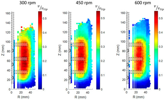 PEPT dimensionless velocity magnitude (v/vtip) at the different impeller speeds of 300 rpm, 450 rpm and 600 rpm. Test case using the bead loading of 2.4 kg and the bottom clearance of 12.7 mm.