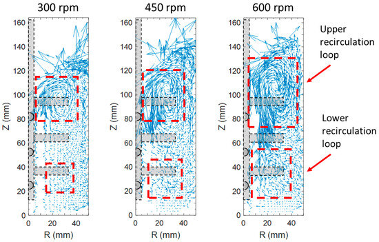 PEPT velocity vector maps for the impeller speed of 300 rpm, 450 rpm and 600 rpm highlighting the recirculation patterns within the attritor. Test case using the bead loading of 2.4 kg and the bottom clearance of 12.7 mm.