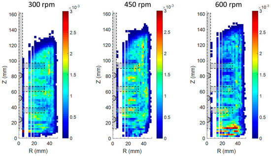 For all the three impeller speeds, the normalised velocity was significantly higher around the impeller-pin locations than in the area beneath the impeller shaft. In the latter area of the equipment the contact between the beads and the impeller pins was indirect and it resulted in a poor exchange of momentum. This caused the formation of a stagnant region where the media motion was feeble. Comparing the three velocity flow fields of Figure 4 two observations can be emphasised. Firstly, the position of the region of the highest dimensionless velocity (around the pins’ location) and its size did not change noticeably when increasing the impeller speed. This agrees with the findings of [11] who observed an increase in media velocity only within the impeller swept zone (where the pins are located) and markedly little variation outside of it. Secondly, from 300 rpm to 600 rpm the media bed was gradually rising upwards towards the top of the vessel due to the increasing centrifugal force generated by the impeller rotation. In fact, as reported by previous PEPT investigations on wet stirred media mills [9,11] an increase of the impeller speed results in the media bed expansion and in the net movement of the media along the vertical attritor axis.
