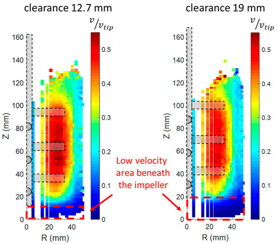 PEPT dimensionless velocity magnitude (v/vtip) for two values of clearance: 12.7 mm and 19 mm. Test case using the bead loading of 2.4 kg and the impeller speed of 300 rpm.