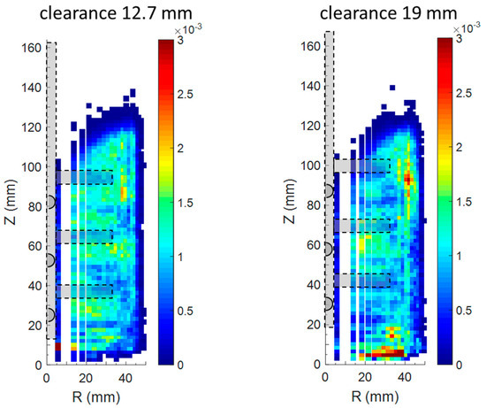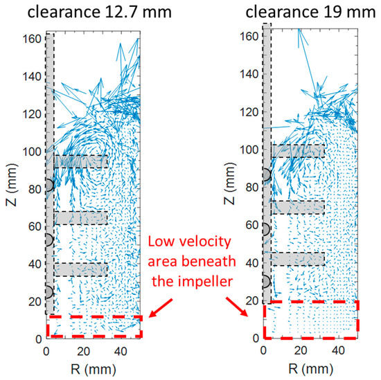 PEPT velocity vector maps for two values of clearance: 12.7 mm and 19 mm. Test case using the bead loading of 2.4 kg and the impeller speed of 300 rpm.