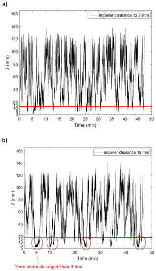 Axial tracer position (Z) as function of the time of the PEPT experiments for two impeller clearance values: (a) 12.7 mm and (b) 19 mm. The impeller position is represented by the red straight line.