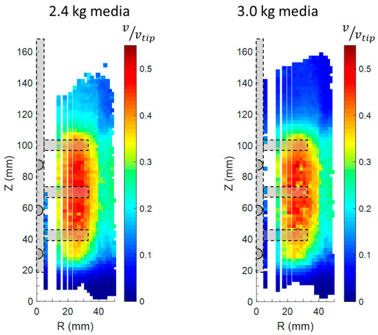 PEPT dimensionless velocity magnitude (v/vtip) for two bead loading: 2.4 kg and 3.0 kg of media. Test case using the clearance of 19 mm and the impeller speed of 600 rpm.